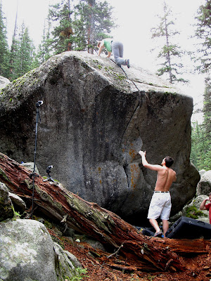 August 5, 2007: Justin Jaeger on Buddy Swalsack, Mount Evans, CO. I suppose moderate means different things to different people, so I've arbitrarily cut this list off at V3. Lots of you have seen pictures of or maybe you've climbed some of these lines which include Dark Crystal, Timeline, The Ladder, BS Squared, Puddle Jumper, Angular Momentum, The Magic Bean, etc., among maybe a few others. Here's another line to add to that exclusive list. The perfect layaways in a crack that narrows to fingers bust out a Yosemite-like overhang, then widen to bomber hands/fists as you turn onto the slab. Unlike anything I've seen anywhere in Colorado, you can definitely add this to my list of 4 & 5 star moderates in the Mount Evans area.